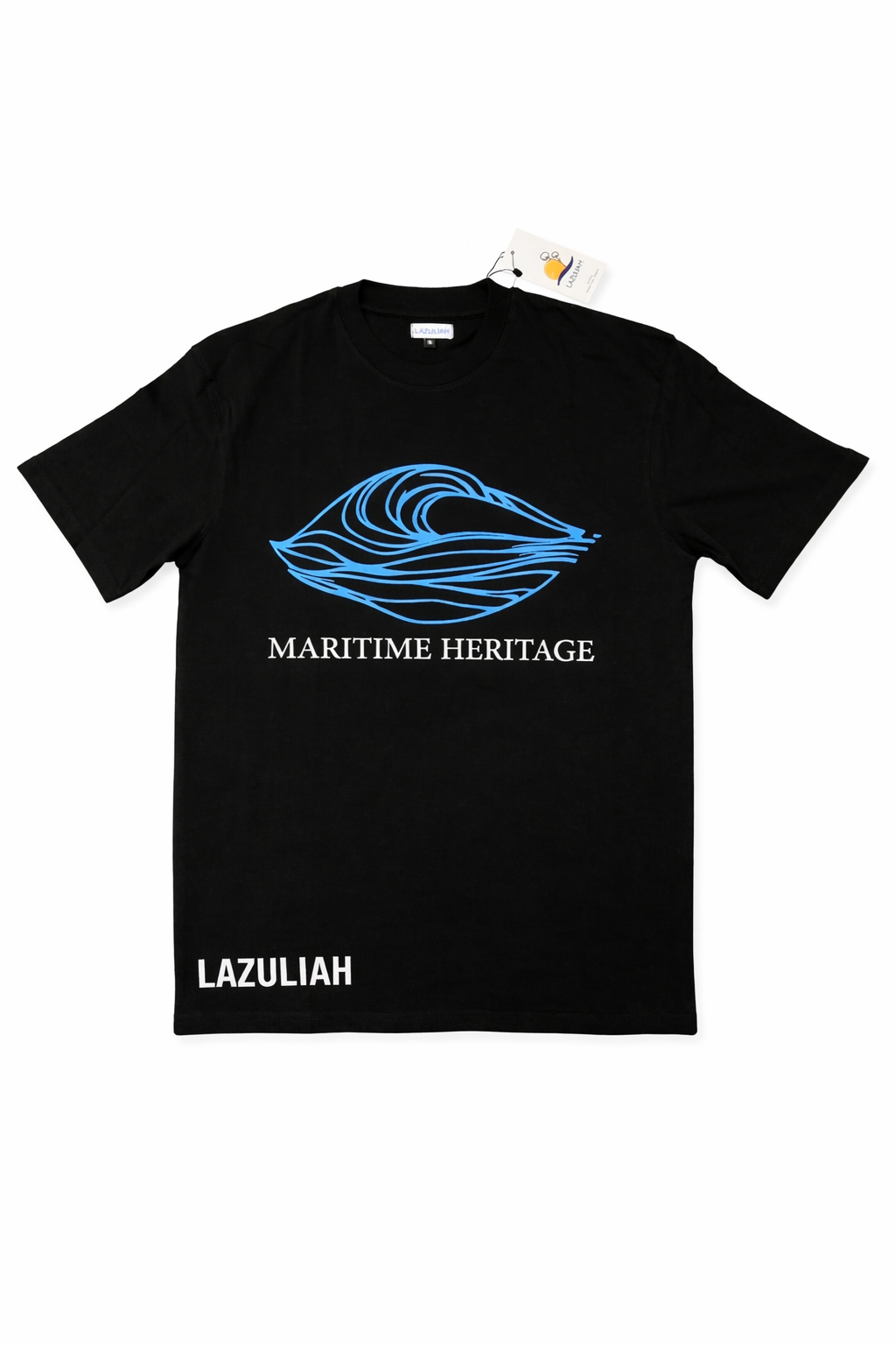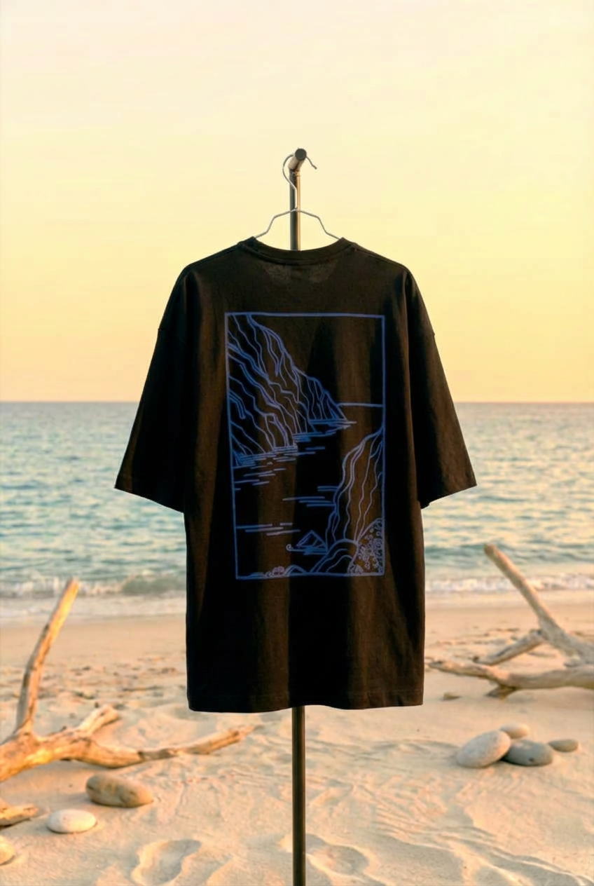 Inspired by the depth and movement of the sea, this oversized Black T-shirt captures Lazuliah’s coastal identity through bold yet refined graphic design. The front wave emblem reflects fluid strength, while the large back illustration evokes Mediterranean cliffs meeting open water — a tribute to maritime heritage and timeless exploration.